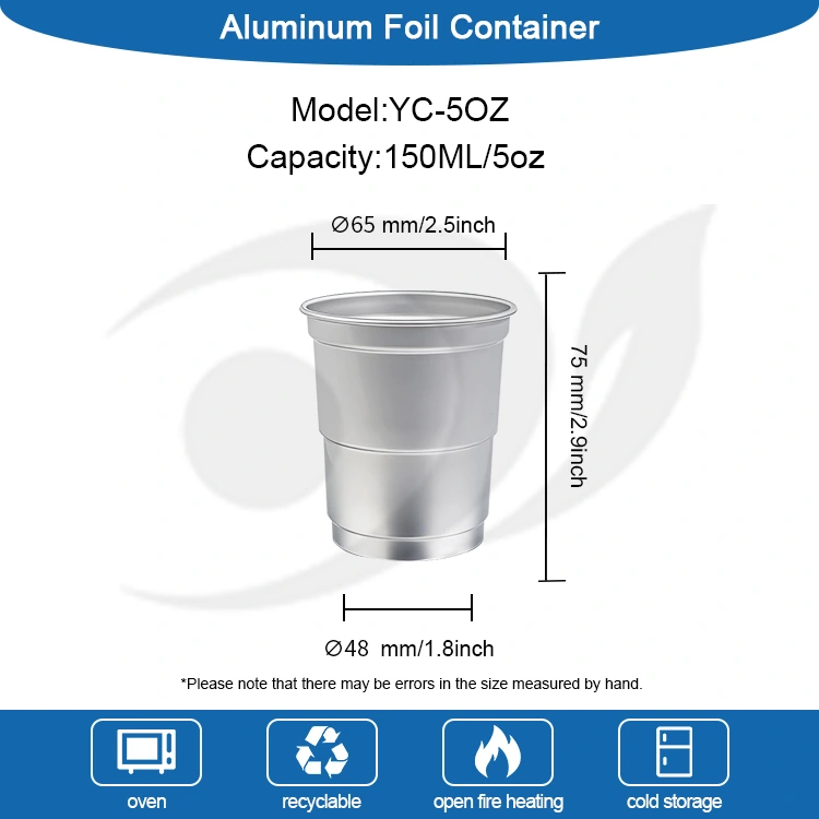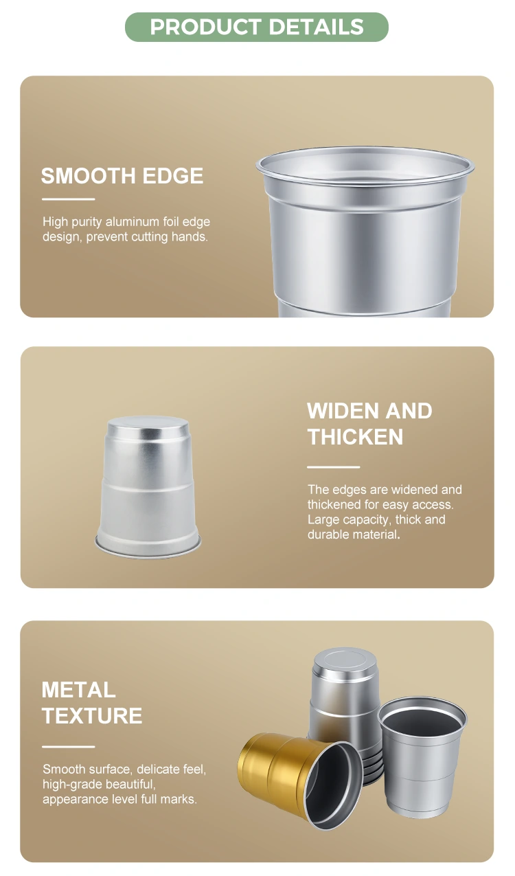 Σενάρια τροφοδοσίας και λιανικής: καφετέριες, καταστήματα τσαγιού γάλακτος και καταστήματα χυμών μπορούν να χρησιμοποιηθούν για την αποθήκευση μικρών ποτών και δειγμάτων. Η εξαιρετική χωρητικότητα και η μεταλλική λάμψη ενισχύουν την υφή της μάρκας. Τα παγωτατζίδικα και τα επιδόρπια μπορούν να χρησιμοποιηθούν ως μίνι κύπελλα για επιδόρπιο για να μεταφέρετε μπάλες παγωτού, μικρές μερίδες μους κ.λπ. Το υλικό αλουμινίου μπορεί να διατηρήσει καλύτερα τη χαμηλή θερμοκρασία και να παρατείνει τη διάρκεια ζωής της γεύσης. Οι επαγγελματικές δυνατότητες παραγωγής του αλουμινίου αλουμινίου Yunchu μπορούν να υποστηρίξουν την προσαρμογή των LOGO της επωνυμίας στο σώμα του ποτηριού, βοηθώντας τους εμπόρους να ενισχύσουν την αναγνώριση της επωνυμίας.