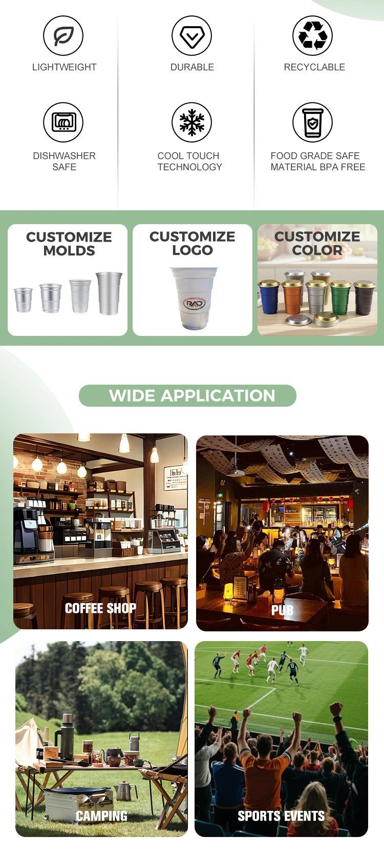 Σενάρια εμπορικής δραστηριότητας: εκθέσεις, συνεντεύξεις τύπου, επαγγελματικά διαλείμματα τσαγιού και άλλες περιστάσεις. Αυτό το κύπελλο αλουμινίου μπορεί να χρησιμοποιηθεί για να χωρέσει ποτά όπως μεταλλικό νερό και ανθρακούχο νερό. Είναι ελαφρύ και εύκολο στη λήψη και η ανακυκλώσιμη ιδιότητά του ταιριάζει στην πράσινη εικόνα γραφείου της εταιρείας. Μπορεί να χρησιμοποιηθεί για την παρασκευή μίνι κοκτέιλ, για συγκράτηση ουίσκι κ.λπ. σε μπάρες και διαφανείς μπάρες. Το μεταλλικό σώμα ποτηριού μπορεί να μεταδώσει γρήγορα δροσιά, να ενισχύσει την παγωμένη γεύση των ποτών και ταυτόχρονα να προσθέσει ένα μοντέρνο στυλ στην ατμόσφαιρα του νυχτερινού κέντρου.