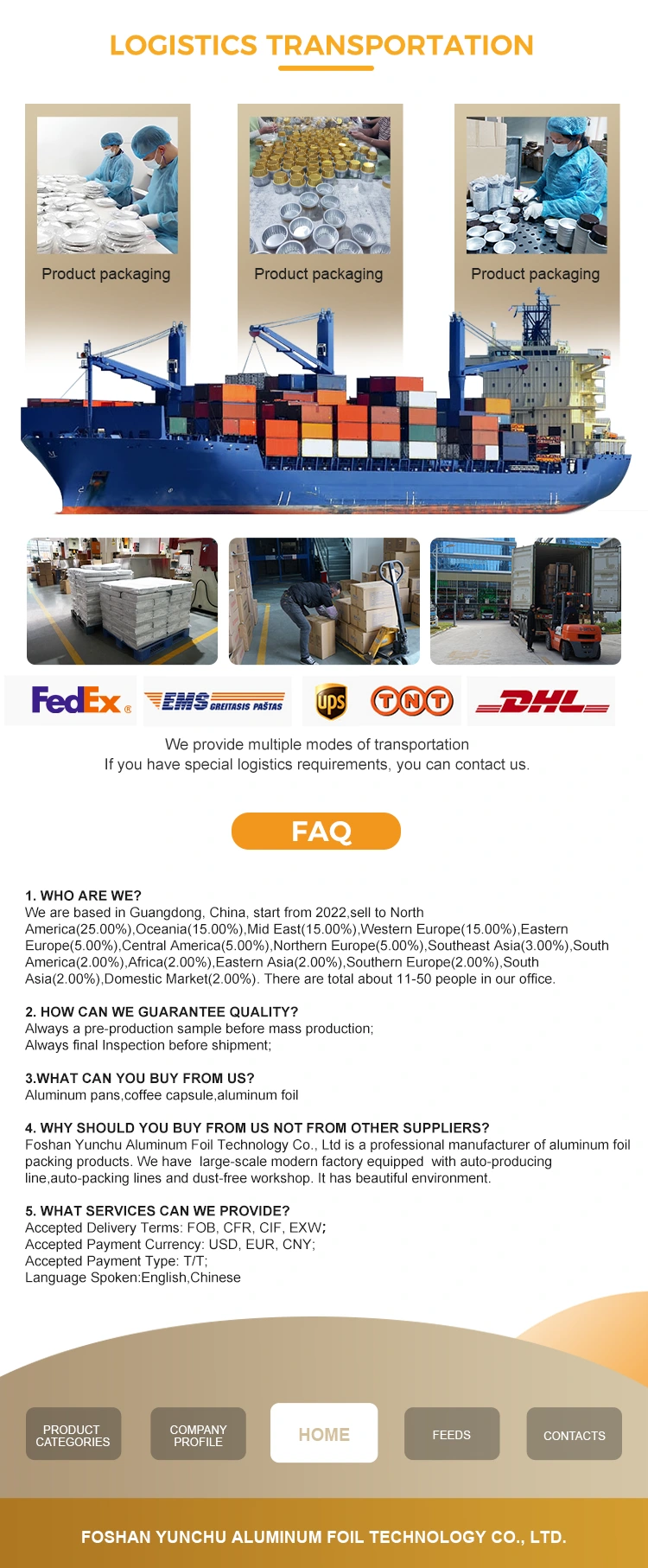 Από τις εμπορικές δραστηριότητες μέχρι την καθημερινή αναψυχή, από εκδηλώσεις μεγάλης κλίμακας έως οικογενειακές σκηνές, ανακυκλώσιμα ανακυκλώσιμα ποτά μίας χρήσης Yunchu αλουμινόχαρτο 5 ουγκιά Το κύπελλο ποτών αλουμινίου καλύπτει τις βασικές ανάγκες διαφορετικών σκηνών με ασφάλεια, ποιότητα, χαρακτηριστικά προστασίας του περιβάλλοντος και ποικίλη προσαρμοστικότητα. Η Foshan Yunchu Aluminium Foil Technology Co., Ltd. τηρούσε πάντα την έννοια του "σεβασμού, της ενότητας και της προόδου" και χρησιμοποιούσε προϊόντα συσκευασίας αλουμινόχαρτου υψηλής ποιότητας ως φορέα για να μεταδώσει την έννοια της βιώσιμης ζωής. Τα προϊόντα της εξάγονται στην Ευρώπη, τις Ηνωμένες Πολιτείες, τη Νοτιοανατολική Ασία και άλλες περιοχές και έχουν κερδίσει την εμπιστοσύνη των πελατών σε όλο τον κόσμο. Η επιλογή των ποτηριών ψύξης από αλουμινόχαρτο Yunchu 5 oz από αλουμίνιο σημαίνει επιλογή ποιότητας, προστασίας του περιβάλλοντος και επαγγελματισμού, κάνοντας κάθε ποτό πρακτική πράσινης ζωής.