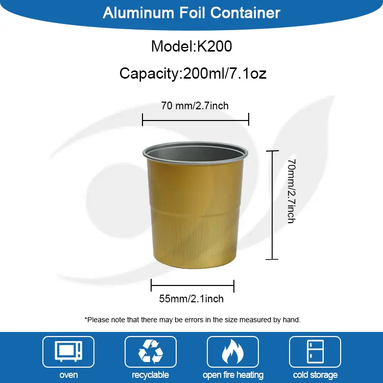 Το μοντέλο K200 διαθέσιμο φορητό κύπελλο κατανάλωσης καφέ που παρέχεται από το εργοστάσιο παροχής αλουμινίου Yunchu αλουμινίου έχει ανώτερη διάμετρο 70 mm (περίπου 2,7 ίντσες), χαμηλότερη διάμετρο 55 mm (περίπου 2,1 ίντσες) και ύψος 70 mm (περίπου 2,7 ίντσες). Η χωρητικότητα είναι περίπου 200 ml (περίπου 4,2 oz). Αυτό το φλιτζάνι ποτό καφέ διαθέσιμης κάμπινγκ είναι κατάλληλο για διάφορες περιπτώσεις, όπως επιχειρηματικές δραστηριότητες, κάμπινγκ, οικογενειακές συγκεντρώσεις κ.λπ., που είναι πρακτική και όμορφη, κατάλληλη για εσάς που ασχολείστε με υψηλή ποιότητα ζωής. Το κύπελλο έχει σχεδιαστεί με παχύτερη επικάλυψη για να διαλύσει ομοιόμορφα τη θερμότητα και να αποφύγει καύση των χεριών.