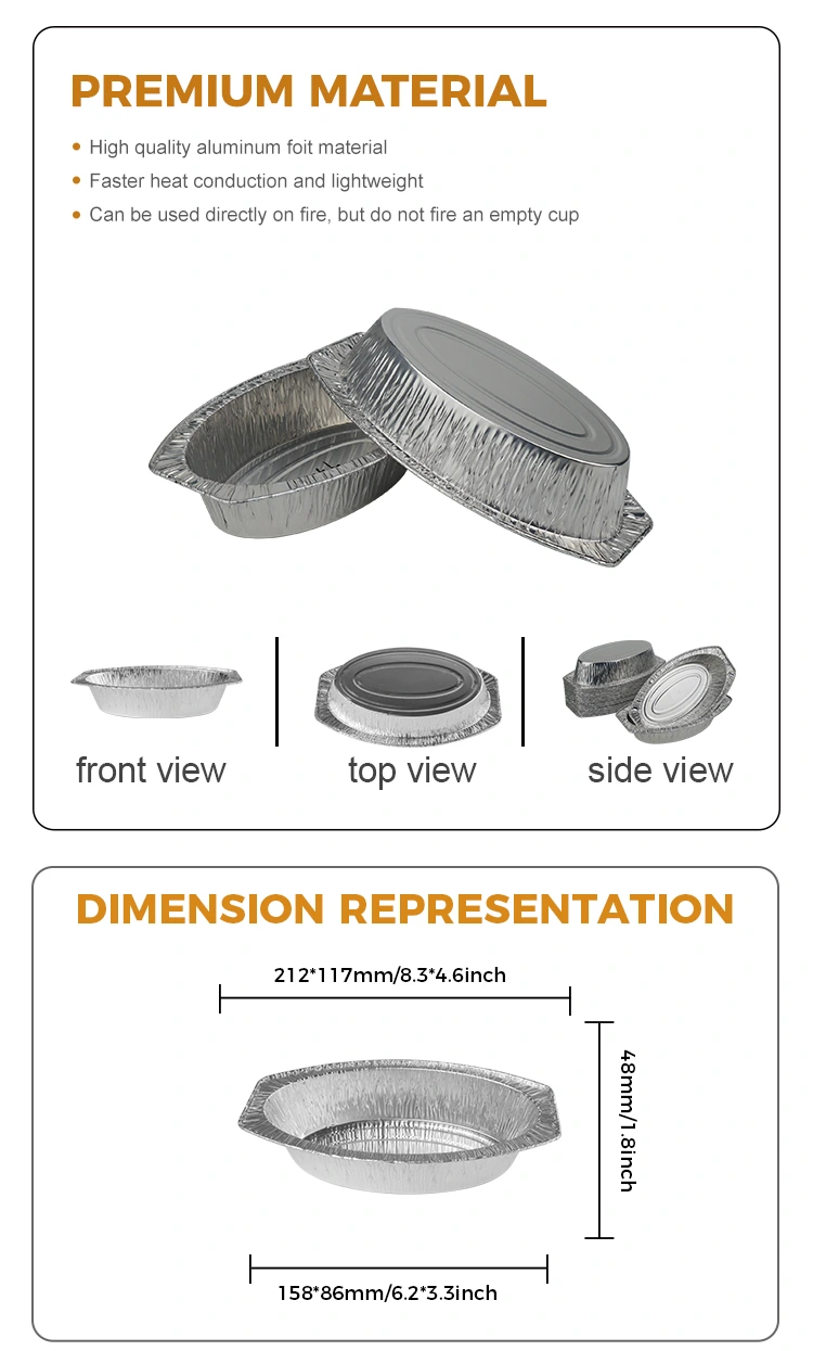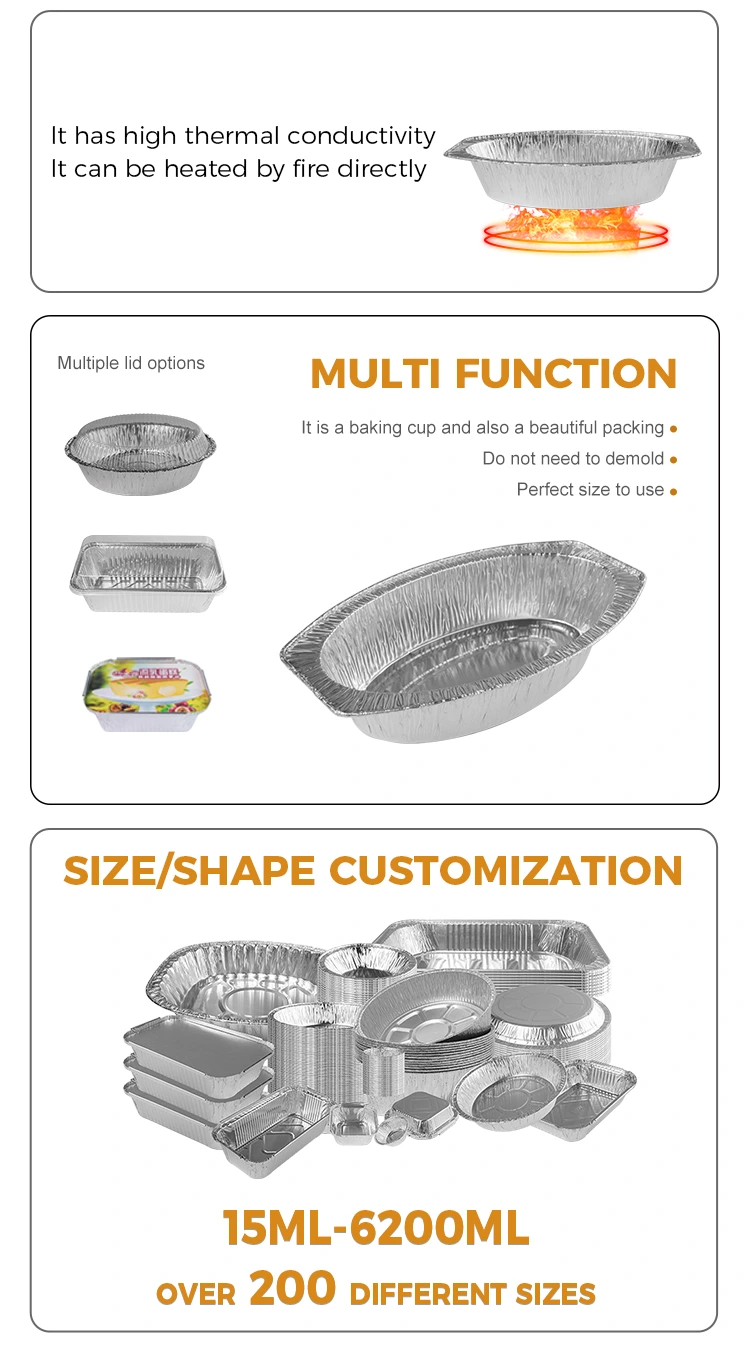 Ο προμηθευτής αλουμινίου αλουμινίου Yunchu προσφέρει δοχεία με ωοειδές ψωμί από αλουμίνιο αλουμινίου για μαγείρεμα στο σπίτι, αρτοποιεία, καταστήματα αλυσίδας και ψυγμένη παράδοση τροφίμων. Κατασκευασμένο από υλικό αλουμινίου από αλουμίνιο, αυτό το δοχείο διαθέτει ένα μοναδικό οβάλ σχήμα που το καθιστά ξεχωριστό ανάμεσα στα πολλά ασημένια κουτιά ψησίματος. Αυτό το δοχείο είναι ιδιαίτερα κατάλληλο για τη συγκράτηση καυτών μαντήλια, τα φρούτα, το ψωμί και όλα τα είδη αντεπιστροφών και μπορεί να καλύψει τις ανάγκες ενός ευρέος φάσματος επιτραπέζιων λογισμικών. Λόγω της καλής θερμικής αγωγιμότητας, μπορεί να διαλύσει ομοιόμορφα τις υψηλές θερμοκρασίες, εξασφαλίζοντας ότι τα τρόφιμα θερμαίνονται ομοιόμορφα. Επιπλέον, έχει μια ορισμένη ικανότητα φορτίου και αντοχή στην πίεση, διατηρώντας σταθερότητα ακόμη και στην περίπτωση πολλαπλών στοίβων, αποτρέποντας την παραμόρφωση και είναι ιδανική για χρήση κατά τη μεταφορά. Προκειμένου να προσαρμοστεί καλύτερα σε διαφορετικά σενάρια και ανάγκες, αυτό το δοχείο μπορεί επίσης να προσαρμοστεί σύμφωνα με τις απαιτήσεις των πελατών και να παρέχει τα αντίστοιχα καπάκια για πρόσθετη πρακτικότητα.