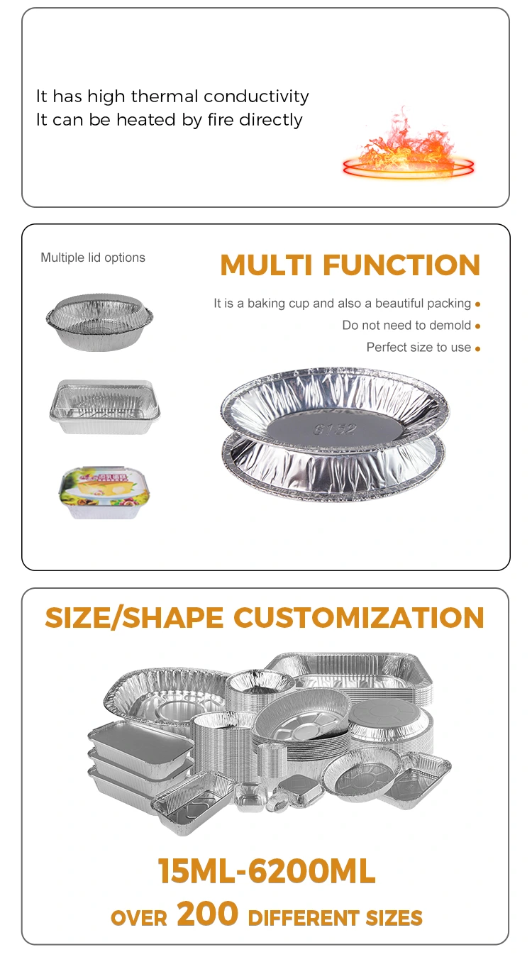 Yunchu αλουμινίου αλουμινίου Οβάλ αυγών τάρτας ασημένιου αλουμινίου αλουμινίου αλουμινίου είναι μοναδικό στην αγορά με τα εξαιρετικά χαρακτηριστικά του προϊόντος. Αυτό το δοχείο διεξάγει θερμότητα ομοιόμορφα και δεν καίγεται εύκολα, εξασφαλίζοντας ότι το φαγητό θερμαίνεται ομοιόμορφα και μαγειρεύει νόστιμο και ασφαλές φαγητό. Οι ανθεκτικές σε πετρέλαιο και ανθεκτικές στις λεκές ιδιότητες καθιστούν εύκολη την απομάκρυνση, με ένα πτυχωτό σχήμα γύρω από αυτό για εύκολη πρόσβαση και ένα στρογγυλεμένο και ομαλό πυθμένα που μπορεί να απομακρυνθεί γρήγορα με ένα κουμπί φωτός. Πετάξτε το μετά τη χρήση, δεν χρειάζεται να καθαρίσετε, κάτι που είναι χωρίς ανησυχία και υγιεινή. Αυτό το δοχείο έχει μεγάλη χωρητικότητα και μπορεί να κρατήσει ταυτόχρονα πολλαπλά συστατικά, καθιστώντας το κατάλληλο για διάφορες ανάγκες ψησίματος. Είτε πρόκειται για τάρτες, κέικ, είτε για κέικ κρόκου αυγού, κέικ μπολ, μπάρμπεκιου και άλλες λιχουδιές, είναι μια ευπροσάρμοστη επιλογή.