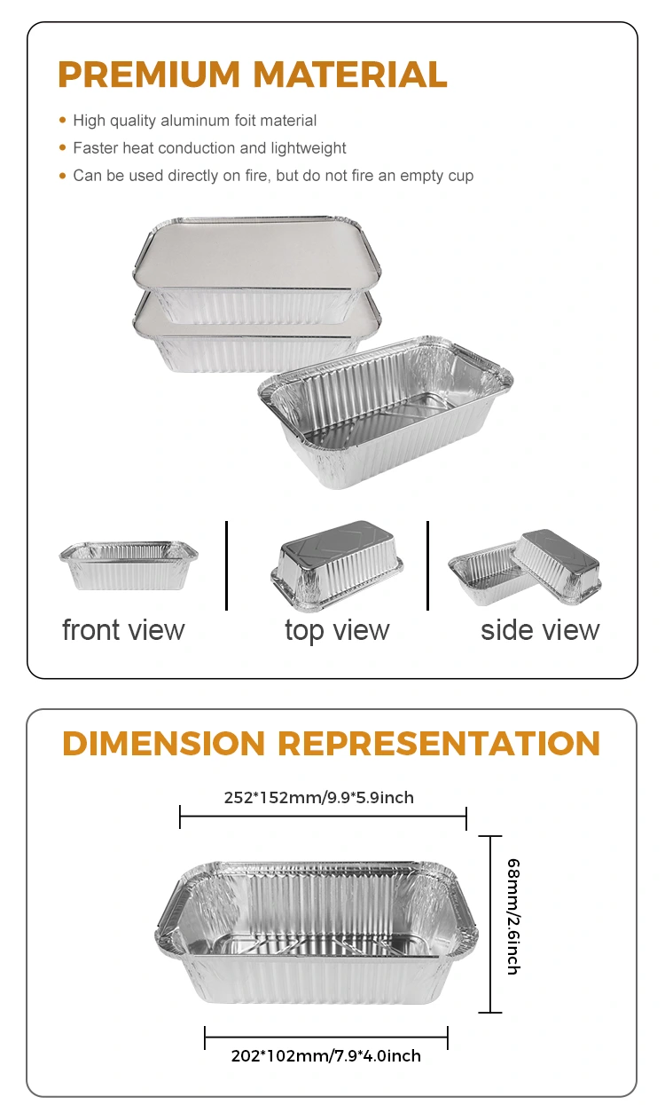 Yunchu αλουμινίου αλουμινίου Αυτή η ορθογώνια φριτέζα που συσκευάζει ασημένια δοχεία αλουμινίου αλουμινίου είναι κατασκευασμένο από υλικό αλουμινίου υψηλής ποιότητας 8011 αλουμινίου, το οποίο έχει εξαιρετική απόδοση μόνωσης θερμότητας και μπορεί να διατηρήσει αποτελεσματικά τη θερμοκρασία των τροφίμων, καθιστώντας το φαγητό πιο νόστιμο και νόστιμο. Ταυτόχρονα, το ορθογώνιο δοχείο αλουμινίου αλουμινίου BBQ είναι επίσης εξοπλισμένο με μια λειτουργία συντήρησης θερμότητας, η οποία μπορεί να επιτευχθεί με την αντιστοίχιση με ένα καπάκι αλουμινίου αλουμινίου ή πλαστικό καπάκι κατοικίδιων ζώων, το οποίο είναι βολικό για προσαρμοσμένο λογότυπο και έτσι ενισχύει την εικόνα της μάρκας.