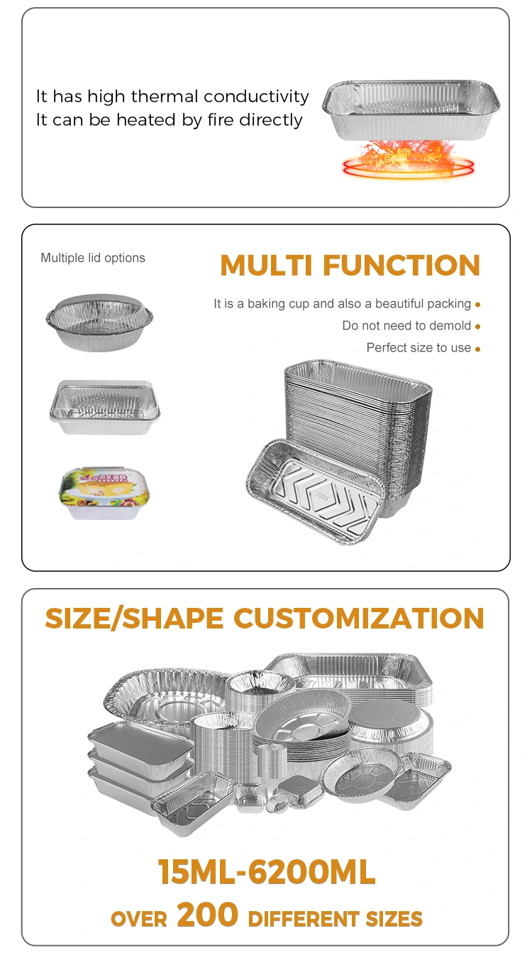 Χαρακτηριστικά: Το μεσημεριανό κουτί χονδρικής 8011 αλουμινίου αλουμινίου είναι κατασκευασμένο από καλή συντήρηση θερμότητας, η οποία μπορεί να διατηρήσει τη θερμοκρασία των τροφίμων και να κάνει το φαγητό πιο νόστιμο. Επιπλέον, το ορθογώνιο μπάρμπεκιου από το δοχείο αλουμινίου αλουμινίου έχει επίσης μια λειτουργία συντήρησης θερμότητας, η οποία μπορεί να ταιριάζει με το καπάκι χαρτιού αλουμινίου και το πλαστικό καπάκι κατοικίδιων ζώων, το οποίο είναι βολικό για να προσαρμόσετε το λογότυπό σας, να εμβαθύνετε περαιτέρω την εντύπωση των πελατών και να βελτιώσετε την εικόνα της μάρκας σας.
