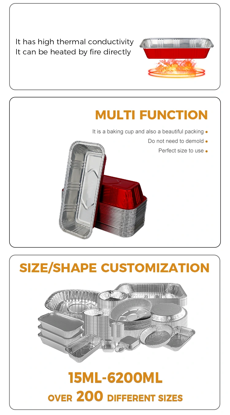 Το αλουμινόχαρτο Yunchu σάς παρέχει υψηλής ποιότητας ορθογώνια κόκκινα δοχεία αρτοποιίας Ασημένια αλουμινόχαρτα, τα οποία είναι σχεδιασμένα να είναι ανθεκτικά και ανθεκτικά στη θερμότητα, μπορούν να μεταδώσουν ομοιόμορφα τη θερμότητα για να αποτρέψουν την απανθράκωση και να έχουν ισχυρή σφράγιση για να διατηρούνται φρέσκα.