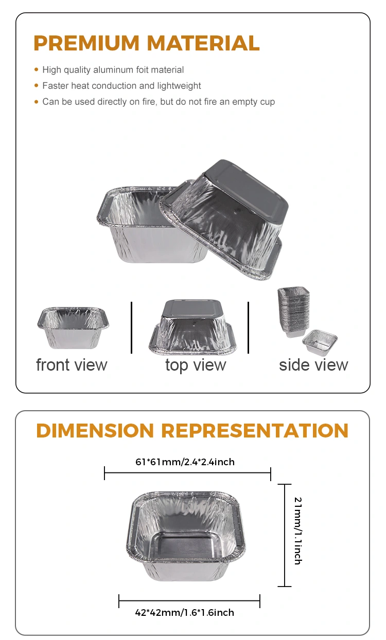 Yunchu αλουμινίου αλουμινίου τετραγωνική φριτέζα ασημένια αλουμινίου αλουμινίου αλουμινίου που μπορούν να χρησιμοποιηθούν σε φρυγανιστές αέρα, μικρά κέικ, μικρά τρόφιμα, παράδοση διαδρομής κ.λπ. και μπορούν να χρησιμοποιηθούν για σάλτσες, βουτιά, μικρά καρυκεύματα και δείγματα ψησίματος. Για να εξασφαλιστεί ότι το δοχείο αλουμινίου μικρής χωρητικότητας που είναι φορτωμένο στο δοχείο είναι φρέσκο, είναι κατασκευασμένο από ασημένιο αλουμινένιο αλουμινίου 8011, το οποίο είναι πλούσιο και κατάλληλο για μια ποικιλία σκηνών.