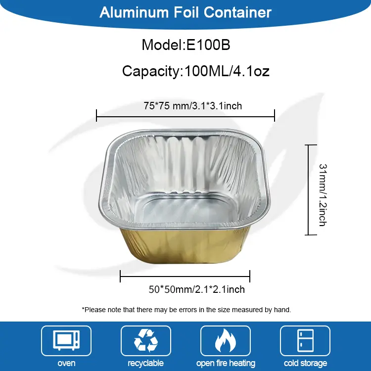 Τα δοχεία αλουμινίου αλουμινίου με τετράγωνο ψησίματος E100B έχουν ανώτερη διάμετρο 75*75mm (2,9*2,9 ίντσες) και η χαμηλότερη διάμετρο 50*50mm (1,9*1,9 ίντσες), το ύψος είναι 31mm (1,2 ίντσες) Η παραμόρφωση, η μη ολισθητήρα και η διαρροή, μπορεί να παραμείνει σταθερή ακόμη και στην περίπτωση θέρμανσης υψηλής θερμοκρασίας, το προϊόν μπορεί να αντέξει σε υψηλή θερμοκρασία στους 220 ° C και μπορεί επίσης να αποθηκευτεί και να αποθηκευτεί, κατάλληλο για μια ποικιλία εξοπλισμού θέρμανσης κουζίνας, όπως φούρνοι αέρα, φούρνοι μικροκυμάτων, δίσκοι ατμού (θέρμανση χωρίς καρύδια). Μπορεί να θερμαίνεται άμεσα, εξοικονομώντας το πρόβλημα της αντικατάστασης των πιάτων και των πιάτων και της βελτίωσης της αποτελεσματικότητας της παραγωγής.