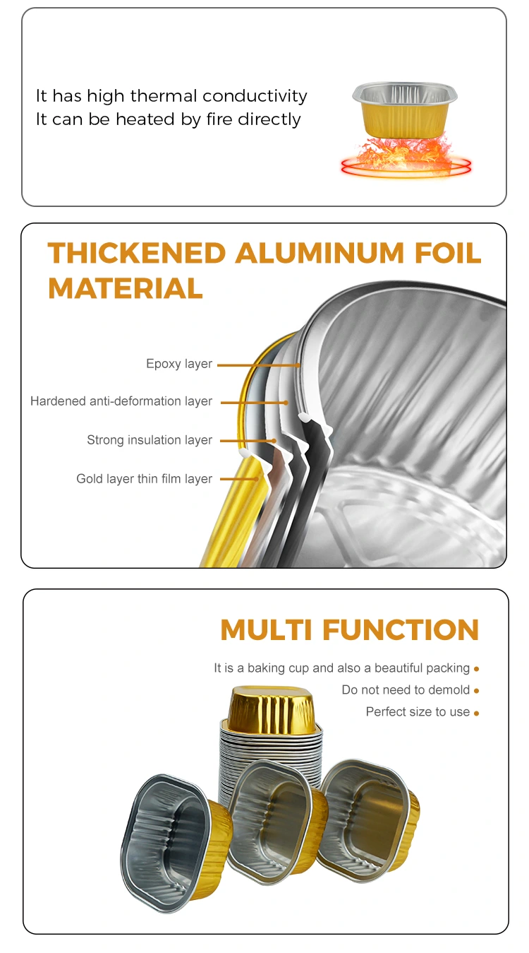 Σχεδιασμένο για να είναι ταυτόχρονα όμορφο και λειτουργικό, τα τετράγωνα κύπελλα ψησίματος για επιδόρπιο Το δοχείο με φύλλο αλουμινίου Smoothwall έχει σχεδιαστεί για να αντέχει σε υψηλές θερμοκρασίες χωρίς να ξεθωριάζει. Είναι κατασκευασμένο από υλικό 8011-0 και έχει μέγιστη θερμοκρασία ανθεκτική στη θερμότητα έως και 660°C. Ο γενικός εξοπλισμός κουζίνας μπορεί επίσης να φτάσει τους 200°C, διασφαλίζοντας ότι τα τρόφιμα δεν θα καούν ή θα σπάσουν. Επειδή είναι κατασκευασμένο από πυκνό υλικό, μπορεί να χρησιμοποιηθεί πολλές φορές. Το όλο θέμα έχει επεξεργαστεί με τέσσερα επίπεδα τεχνολογίας. Μετά το μαγείρεμα, μπορείτε να το σηκώσετε και να το φάτε χωρίς να ανησυχείτε για παραμόρφωση. Επιπλέον, είναι επίσης πολύ βολικό στο καθάρισμα και μπορείτε να επικοινωνήσετε απευθείας με τα συστατικά για να διατηρήσετε την υγιεινή.