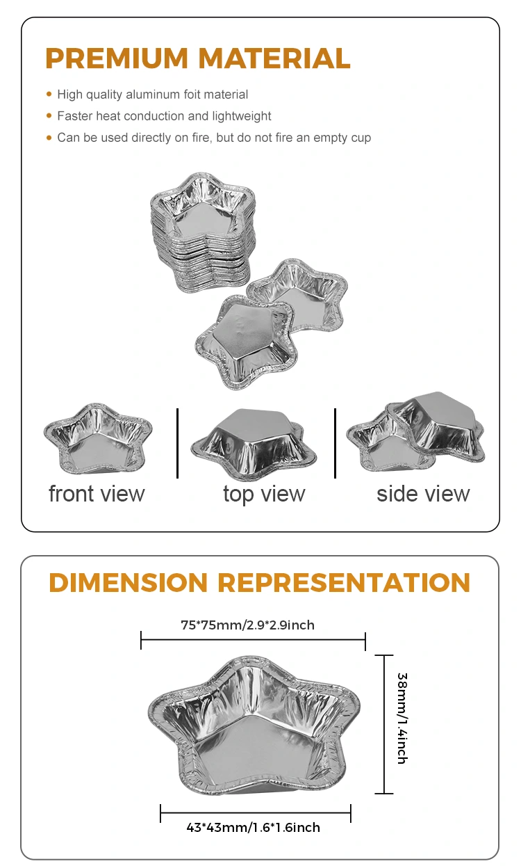 Οι κούπες τάρτας από αλουμινόχαρτο σε σχήμα αστεριού είναι κατασκευασμένες από αλουμινόχαρτο ασήμι και έχουν αντοχή σε υψηλή θερμοκρασία, παραμένοντας σταθερές μεταξύ -20°C και 300°C. Είναι κατάλληλα για χρήση στο ψήσιμο και τη φριτέζα αέρα και μπορούν να αποτρέψουν τη ζημιά στα εσωτερικά τοιχώματα της συσκευής. Είναι μιας χρήσης, καθιστώντας τα βολικά καθώς δεν απαιτείται καθαρισμός.